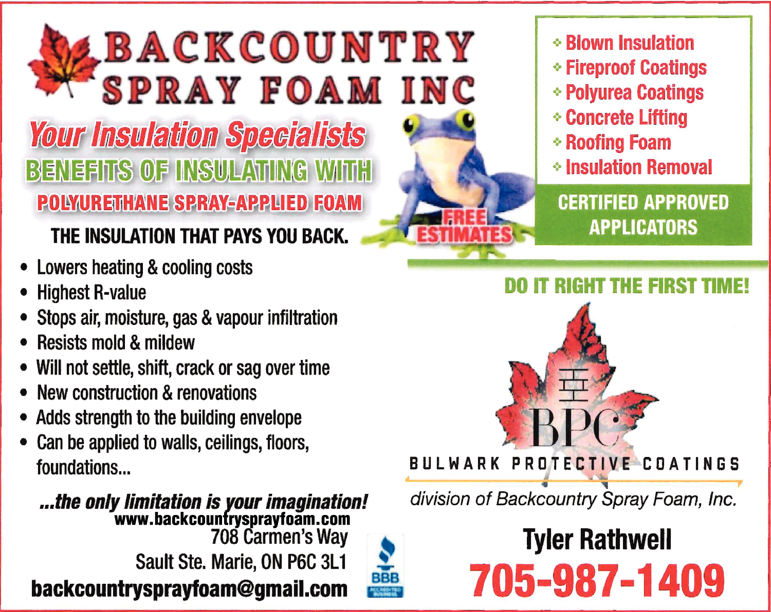 Since 2010, Backcountry Spray Foam Inc. has been helping homeowners and businesses as a local spray foam insulation company in Sault Ste. Marie lower their heating and cooling costs with cutting-edge insulation and protective coatings. Locally owned and BBB-accredited, we offer blown insulation, roofing foam, and polyurea coatings, all expertly applied by our certified team to create energy-efficient, comfortable spaces year-round. From reducing energy bills to enhancing durability with fireproof coatings and concrete lifting, we' re here to make a difference in your space and savings. Call today and start saving on your heating and cooling costs with Backcountry Spray Foam Inc.