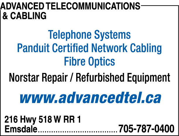 Located at 216 Hwy 518 W RR 1 in Emsdale, we are easily accessible and serve the surrounding areas. To learn more about our services and how we can assist you, please visit our website at www.advancedtel.ca or contact us at 705 787-0400.