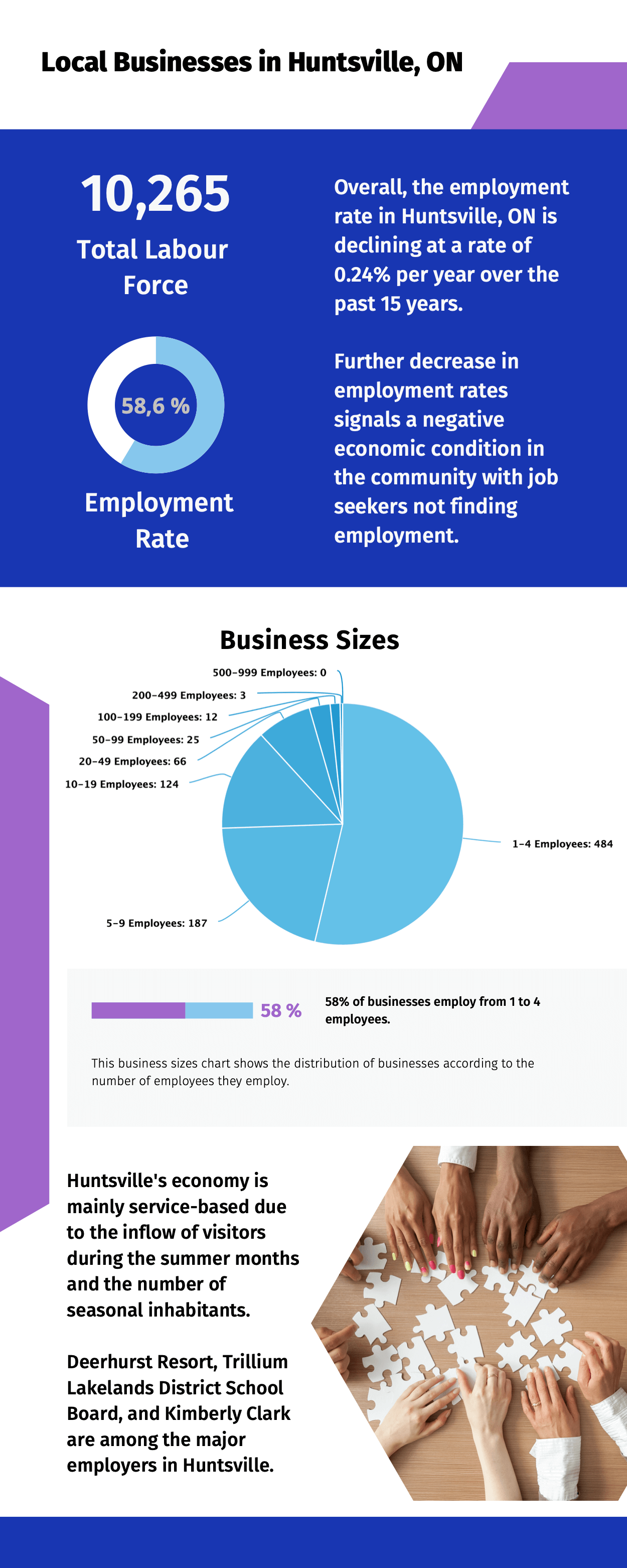 Huntsville's economy is mainly service-based due to the inflow of visitors during the summer months and the number of seasonal inhabitants. Construction trades employ a large number of people. Despite improvements, Huntsville's unemployment rate has historically been higher than the provincial average. That is mainly owing to the seasonal nature of its tourist business.
