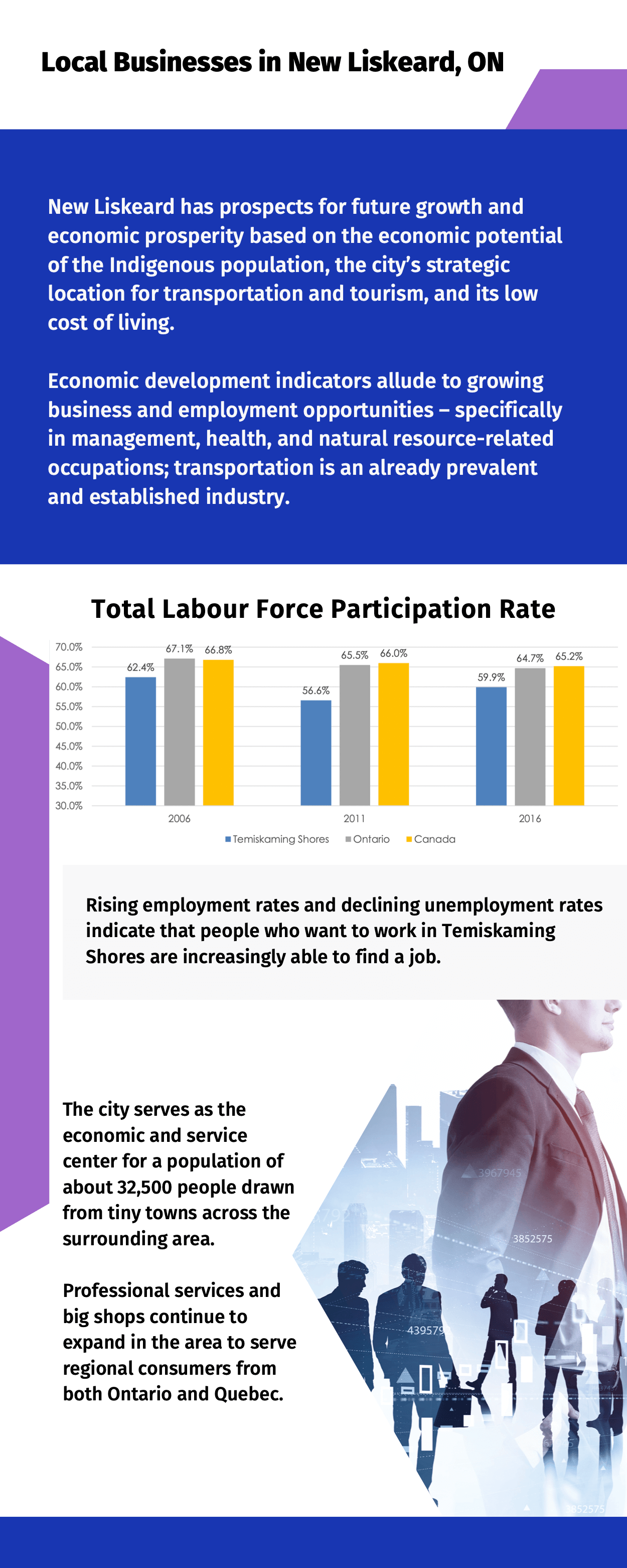 The city serves as the economic and service center for a population of about 32,500 people drawn from tiny towns across the surrounding area. Professional services and big shops continue to expand in the area to serve regional consumers from both Ontario and Quebec.