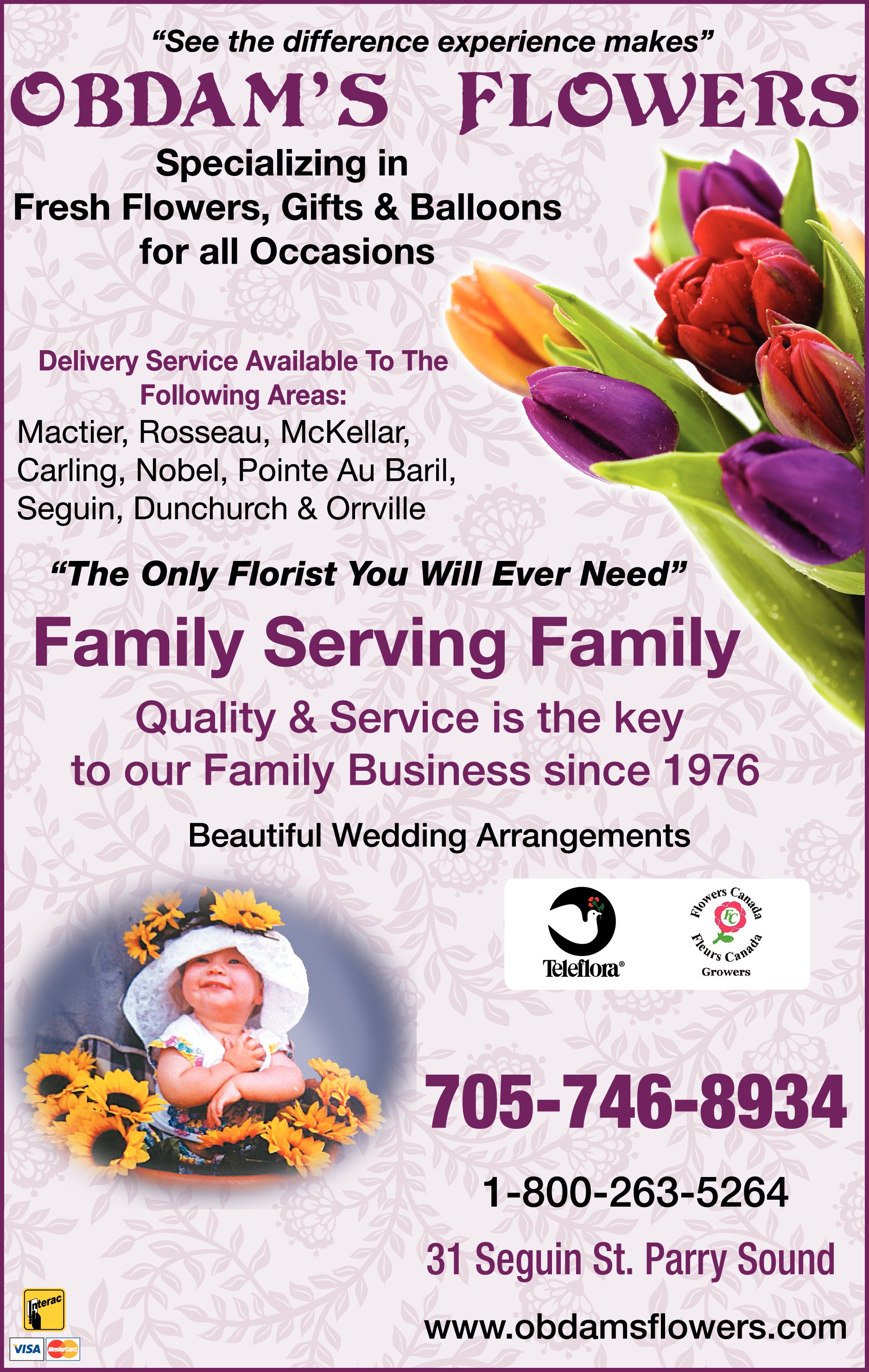 Names and Numbers Verified Balloons - Novelty Florists Formal Wear FUNERAL PLANS - PRE-ARRANGEDOrder flowers online from your florist in Parry Sound, ON. Obdam's Flowers, offers fresh flowers and hand delivery right to your door in Parry Sound.