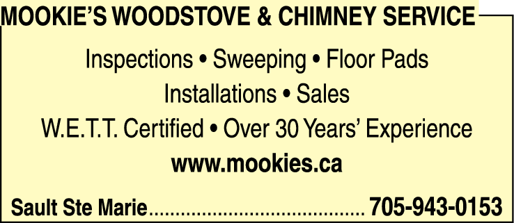 Names and Numbers Verified Chimney Cleaning & Sweeping Chimney CleaningMookie's Woodstove & Chimney Service is a reputable business in Sault Ste Marie with over 30 years of experience in the industry. We specialize in providing a wide range of services including inspections, sweeping, floor pad installations, sales, and more. Our team is W.E.T.T. c…