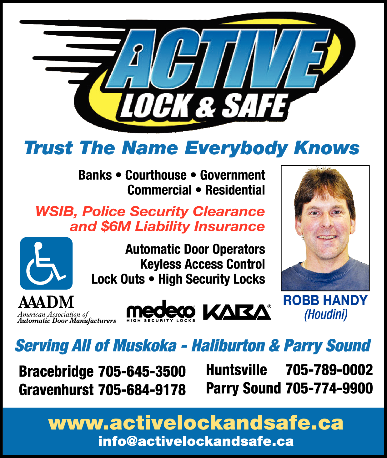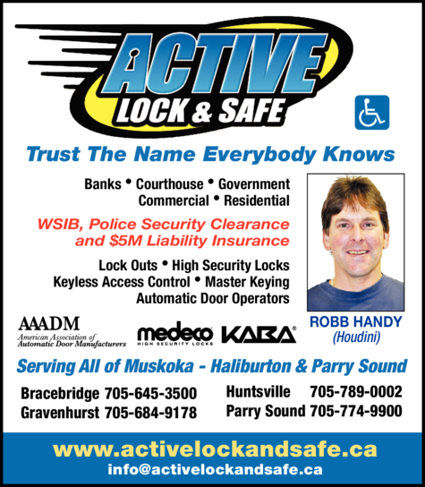 Names and Numbers Verified LocksmithsAccredited Loksmithing, providing service for lockouts, keyless entry, panic bars, door closers, window bars, locks rekeyed, master keying. We serve these area: Muskoka & Surrounding Areas, Huntsville, Bracebridge, Gravenhurst, Parry Sound, Port Carling, Bala, Mactier, Algonquin…