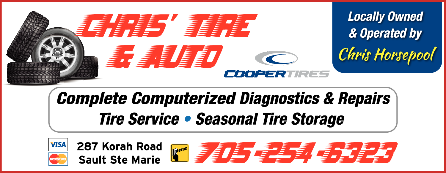 Names and Numbers Verified Tire DealersChris' Tire & Auto Coopertires is a locally owned and operated business located at 287 Korah Road, Sault Ste Marie. We specialize in providing complete computerized diagnostics and repairs for all types of vehicles. With our state-of-the-art equipment and experienced technicians…